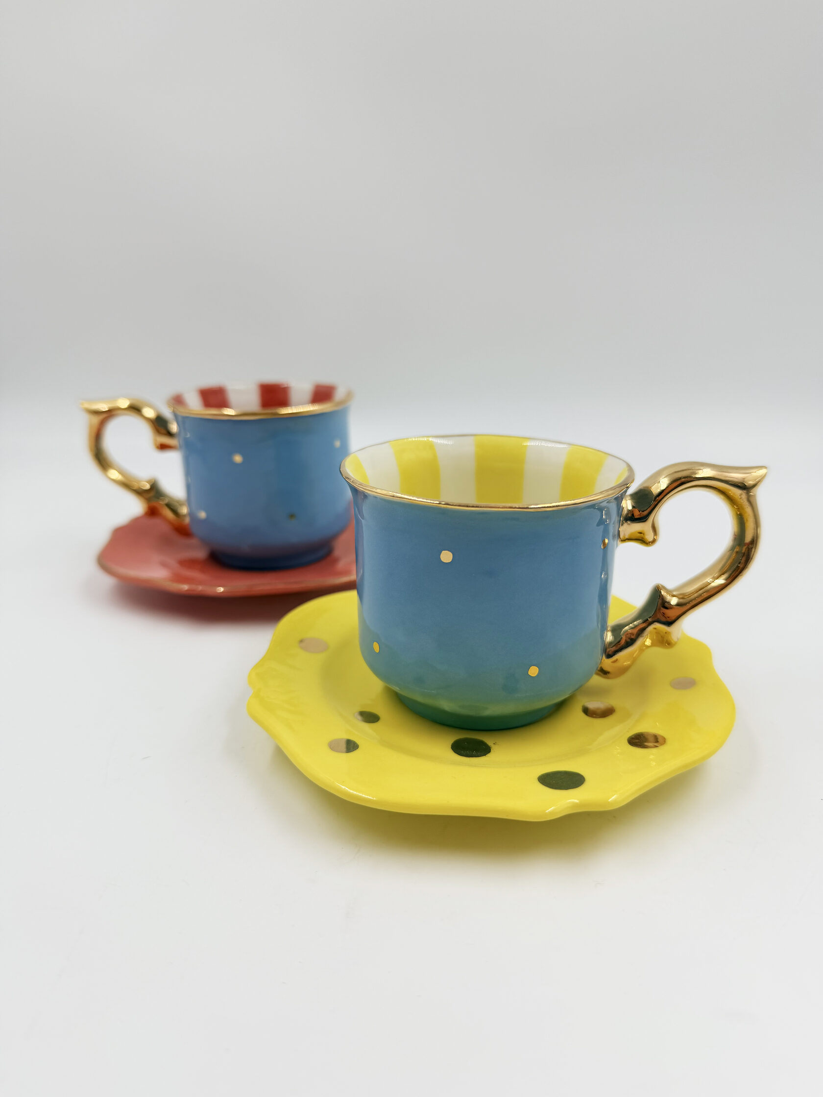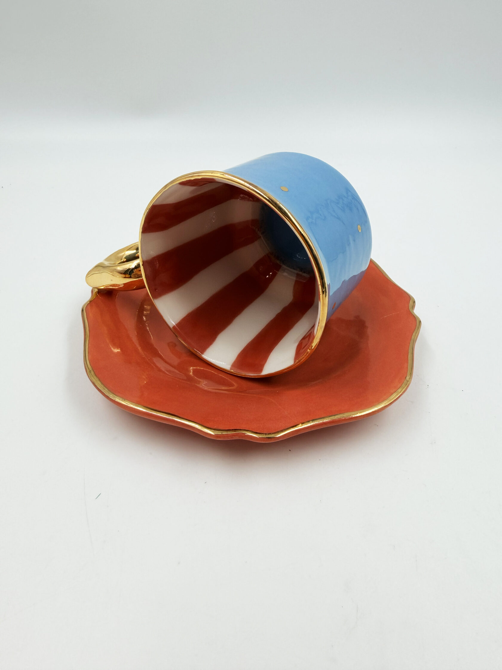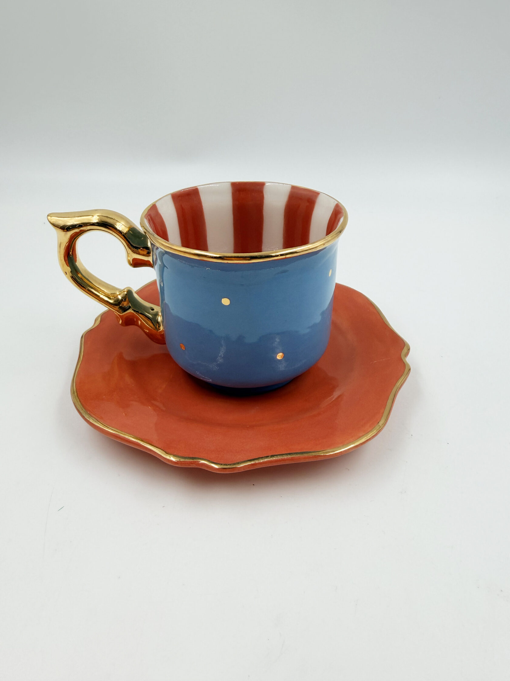 Фарфоровая легкая кофейная пара объемом 125 мл Каждая полосочка нарисована вручную. Элементы росписи покрыты настоящим золотом. Можно мыть в посудомоечной машине, но нельзя ставить в микроволновую печь. В комплекте идет фирменная подарочная упаковка.