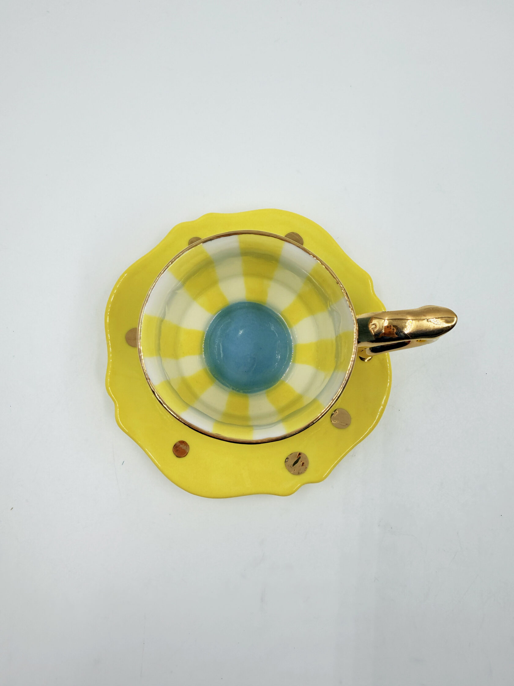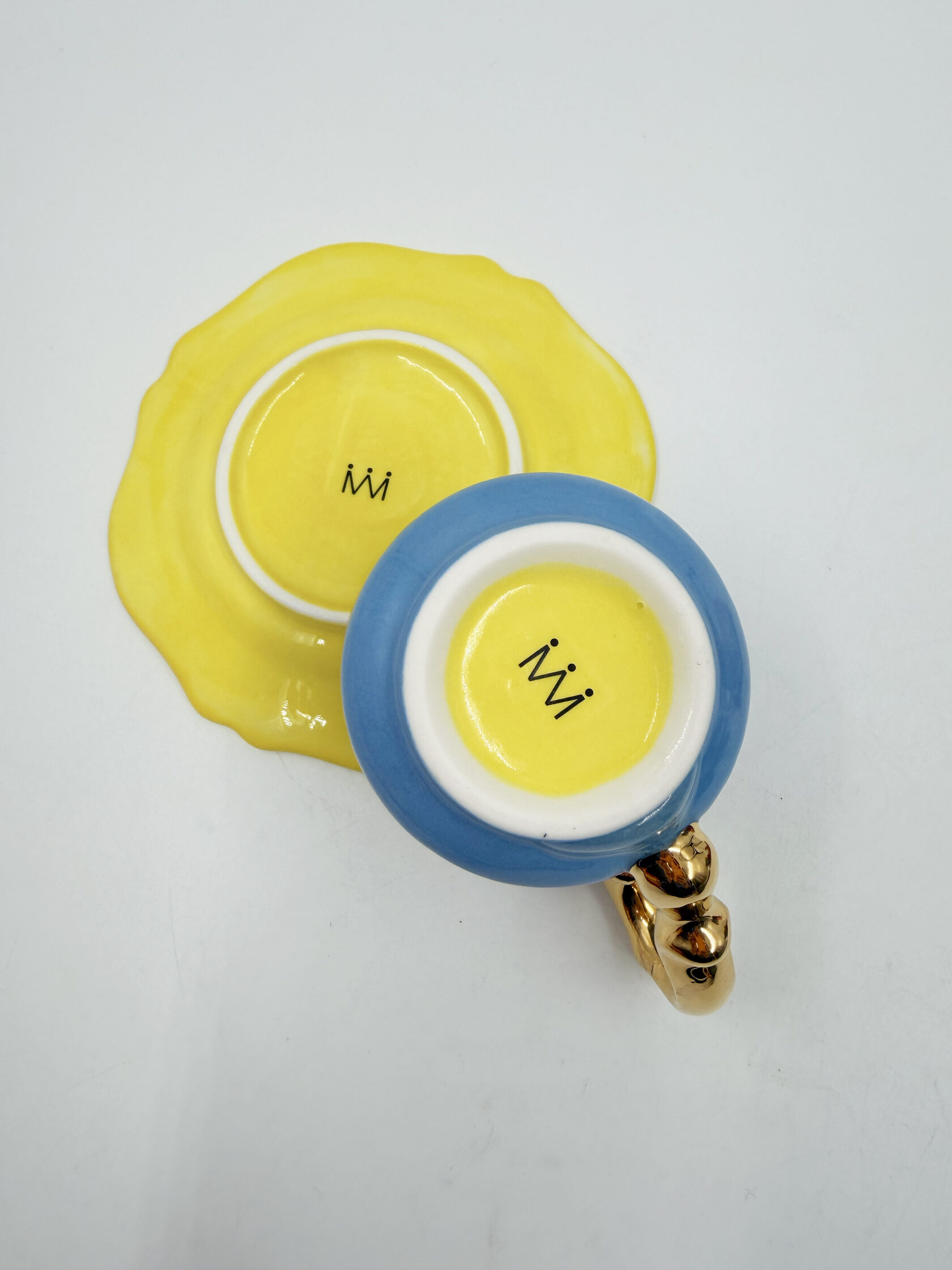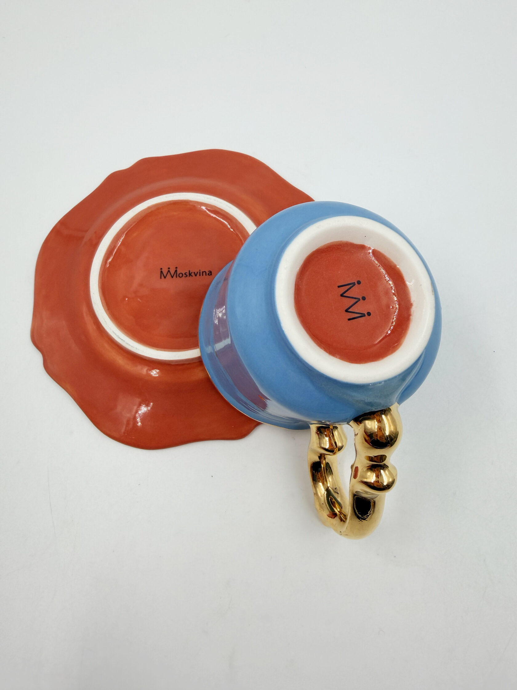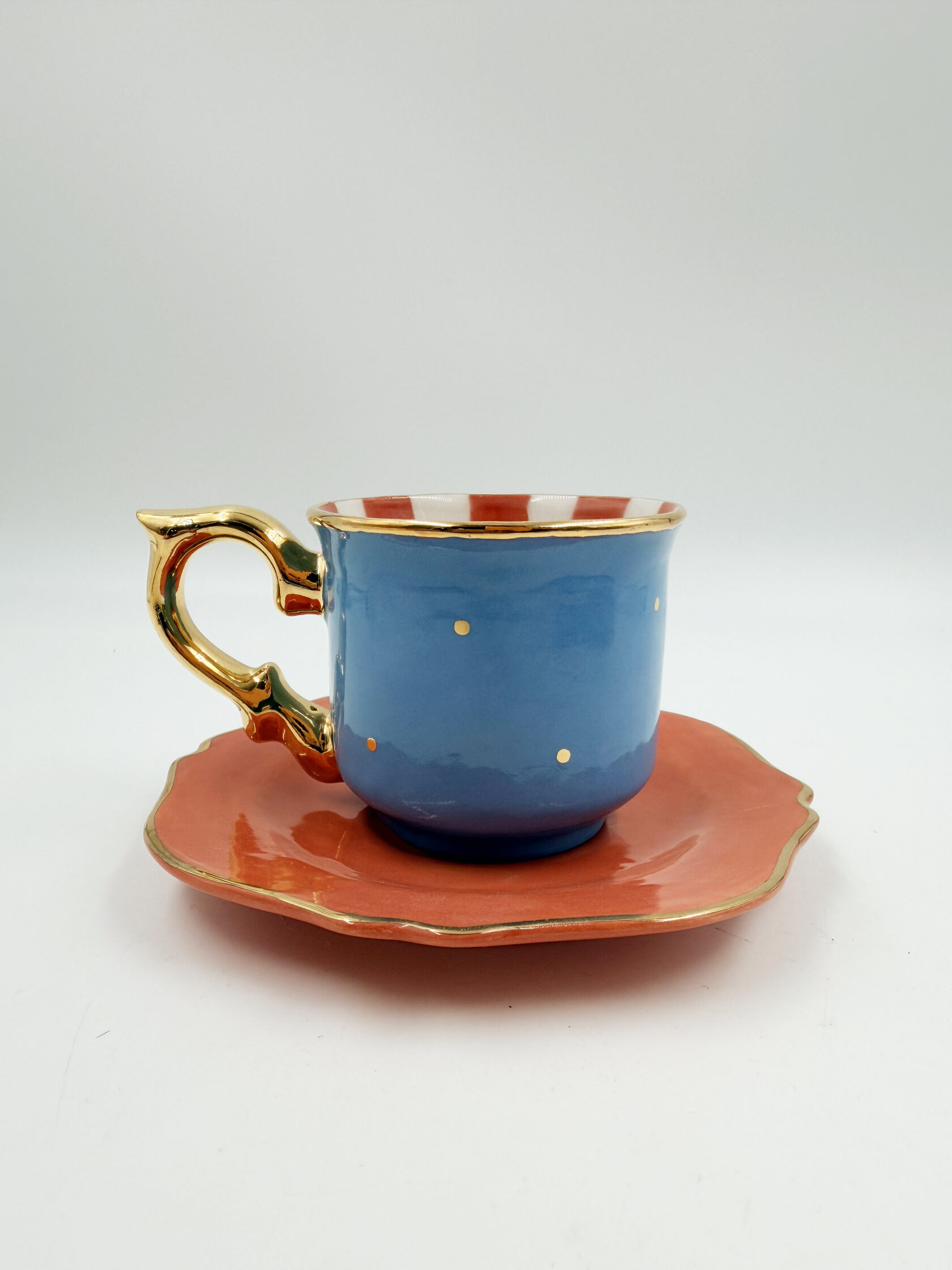 Фарфоровая легкая кофейная пара объемом 125 мл Каждая полосочка нарисована вручную. Элементы росписи покрыты настоящим золотом. Можно мыть в посудомоечной машине, но нельзя ставить в микроволновую печь. В комплекте идет фирменная подарочная упаковка.